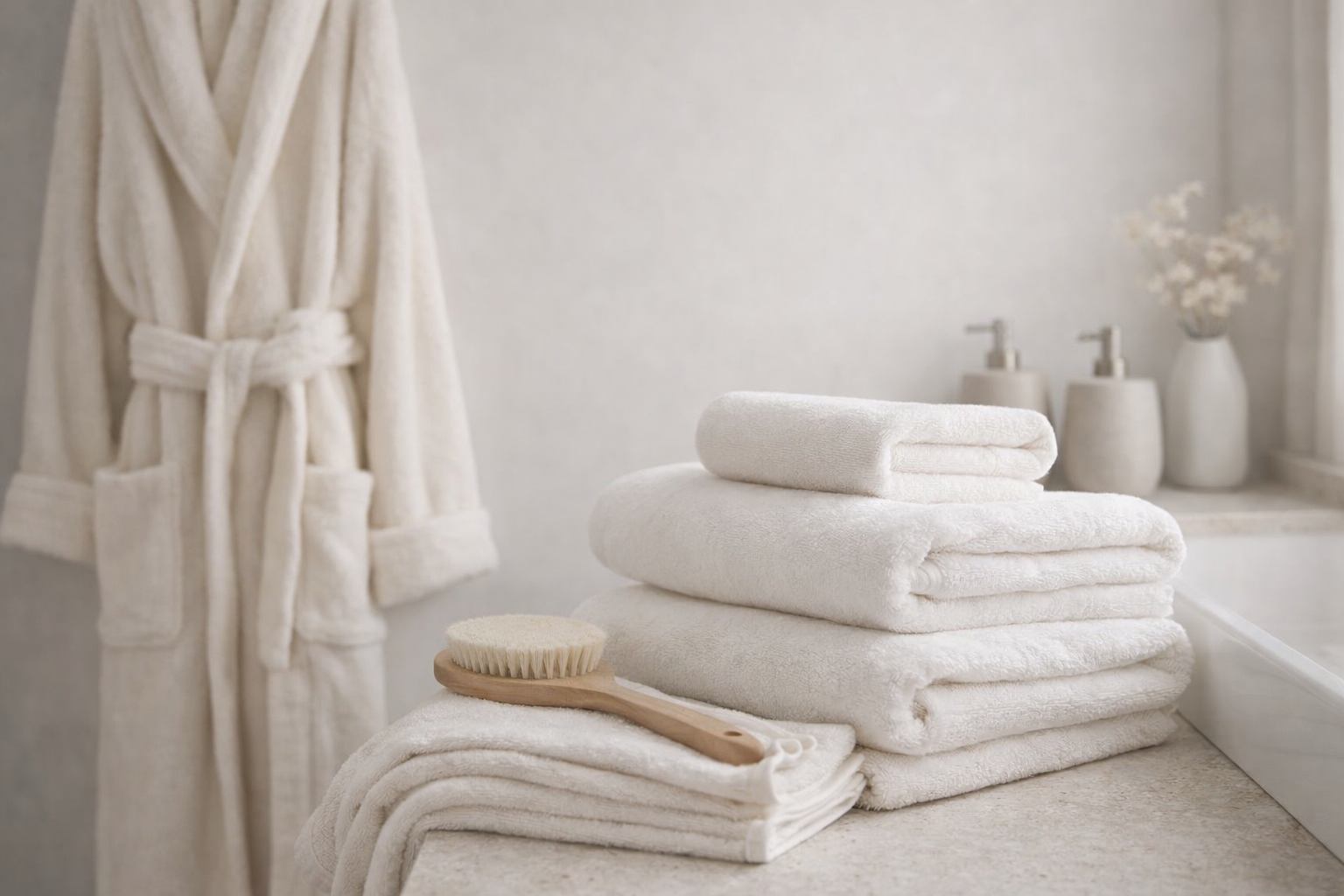 Sanfte Badtextilien und stilvolle Details verwandeln Ihr Badezimmer in eine Wohlfühloase. Genießen Sie Komfort, Ruhe und ein harmonisches Ambiente für jeden Tag.